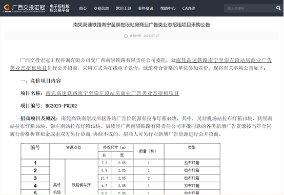 近日,宏冠公司依托自身的電子招標(biāo)投標(biāo)交易平臺,圓滿完成南憑高速鐵路南寧至崇左段站房商業(yè)廣告類業(yè)態(tài)招租項(xiàng)目。該項(xiàng)目是公司承接的首個網(wǎng)上電子競價項(xiàng)目,內(nèi)容為南憑高鐵南崇段所轄各站廣告位資源44塊有拉布燈箱整體打包招租。